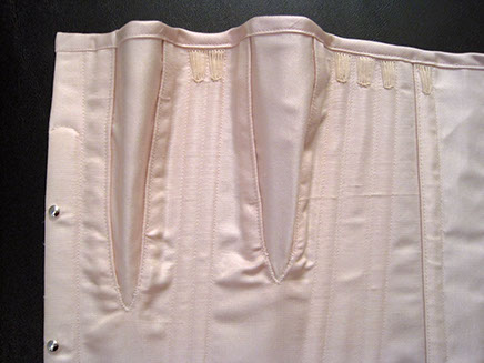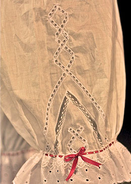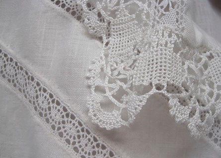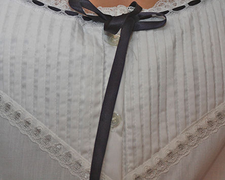 Machine sewn pin tuck panels, lace decoration, lace edging, and functional button holes.