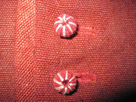 Hand sewn decorative buttons on wood bases with hand sewn buttonholes.